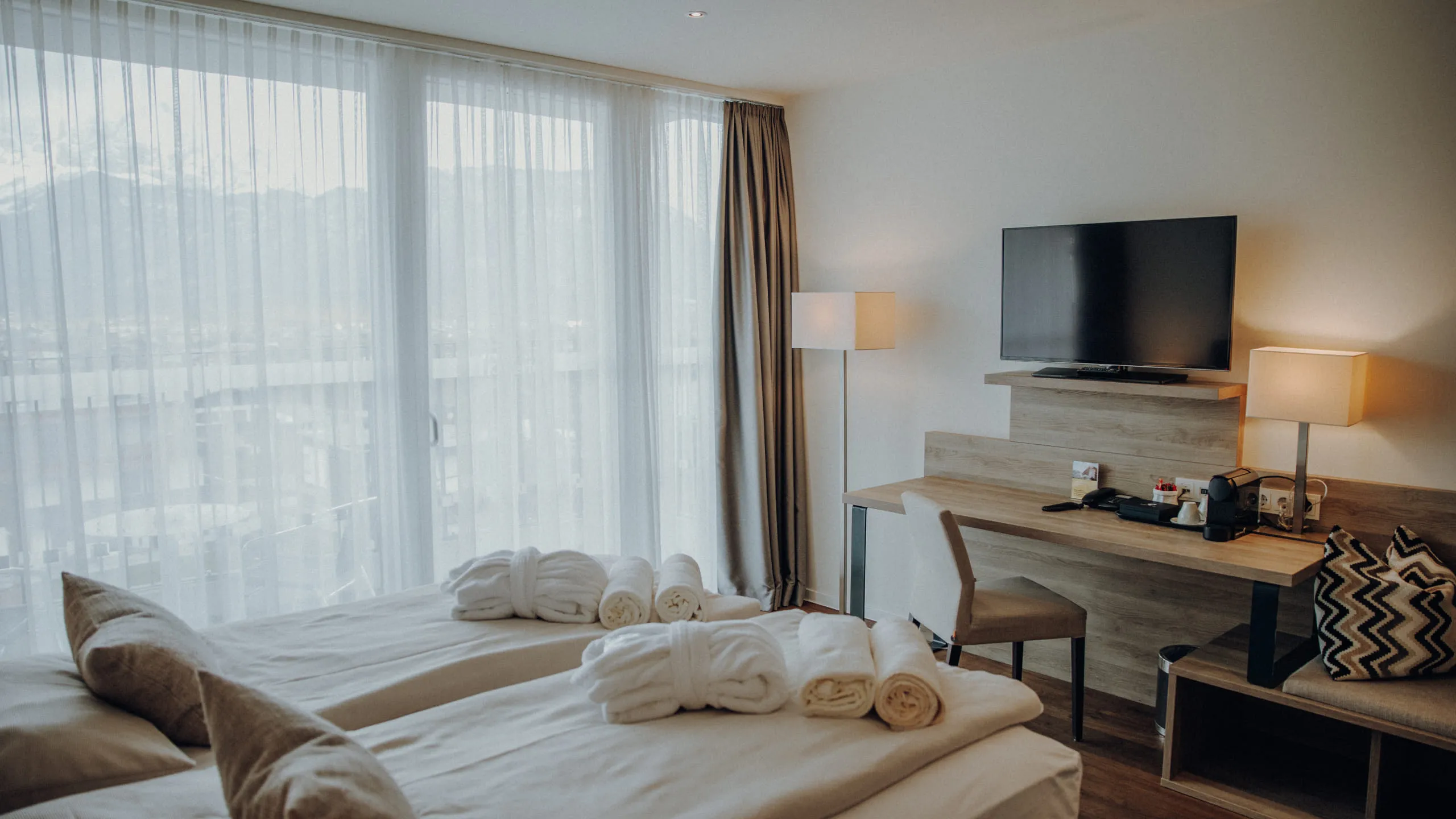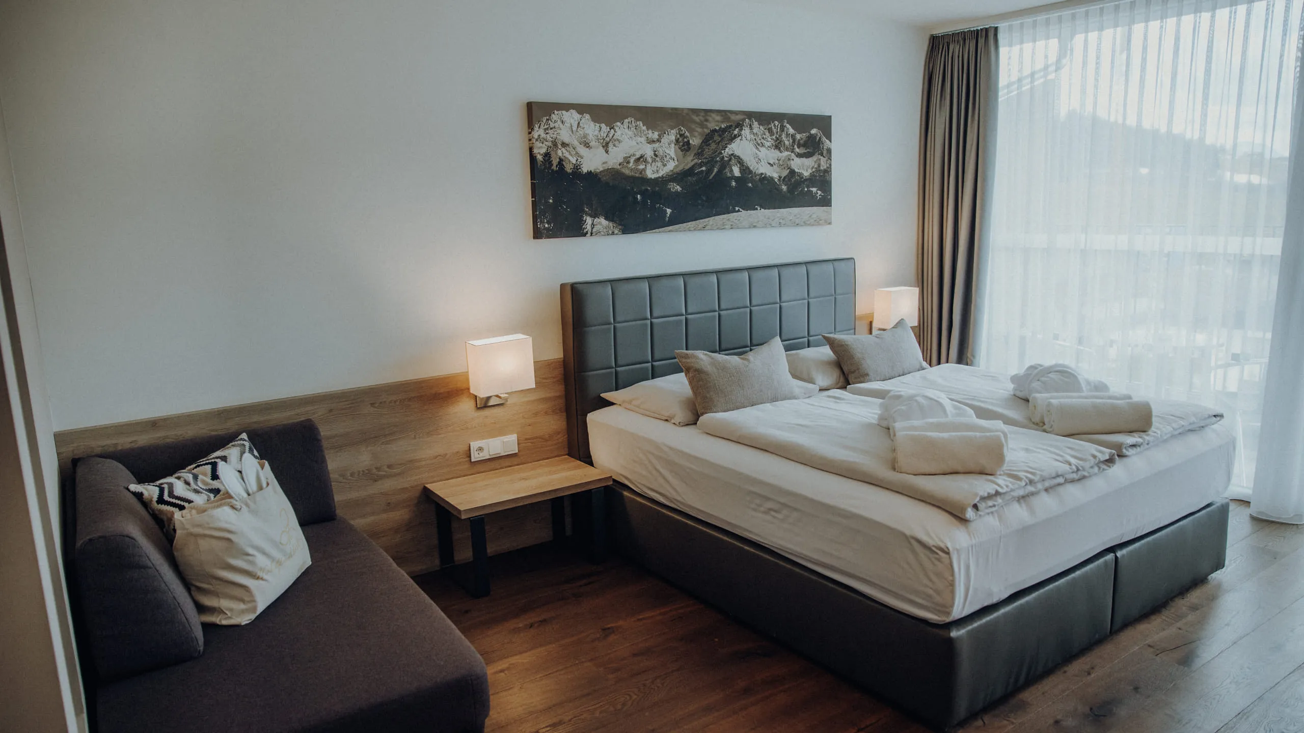 Im Alpenhotel Kaiserfels in St. Johann in Tirol erwartet euch modernes Wohnen mit alpinem Flair. Unsere Zimmer und Suiten verbinden klare Eleganz mit regionalem Stil: helle Materialien, hochwertige Ausstattung und große Fenster schaffen eine angenehme, ruhige Atmosphäre, in der ihr euch sofort wohlfühlt.