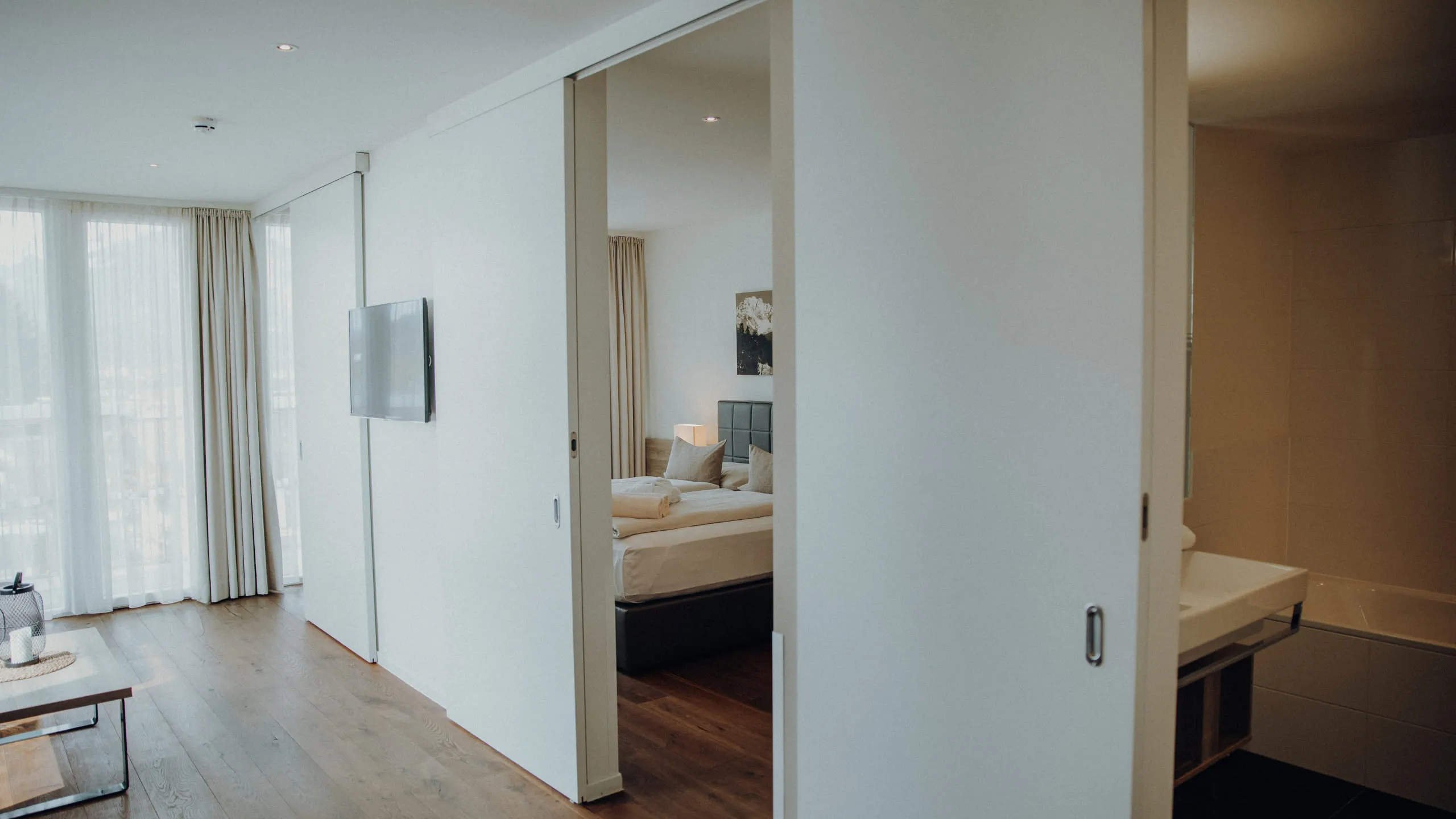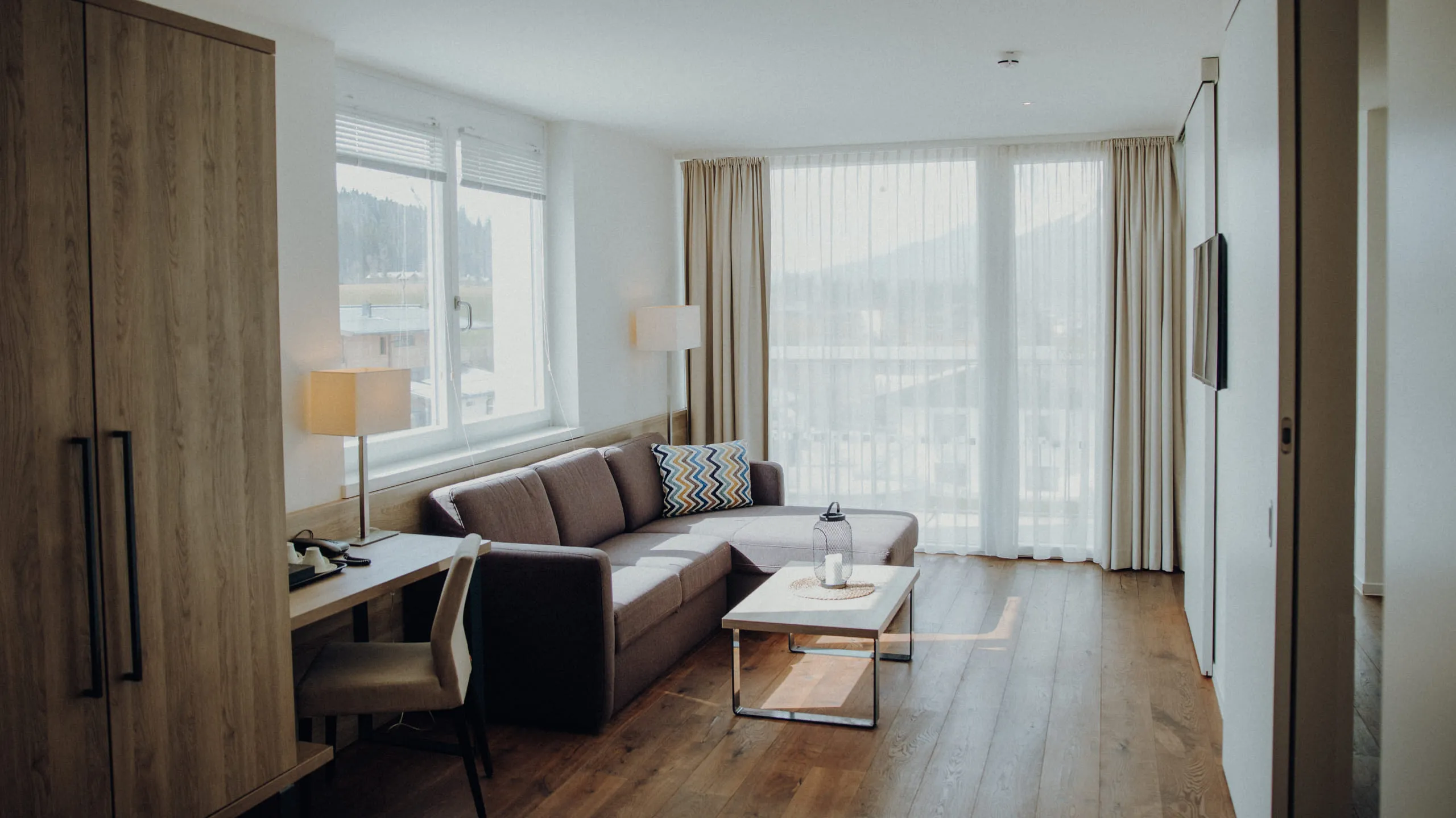 - Hochwertige Zimmerausstattung mit Boxspringbett, Echtholzmobiliar und Regendusche